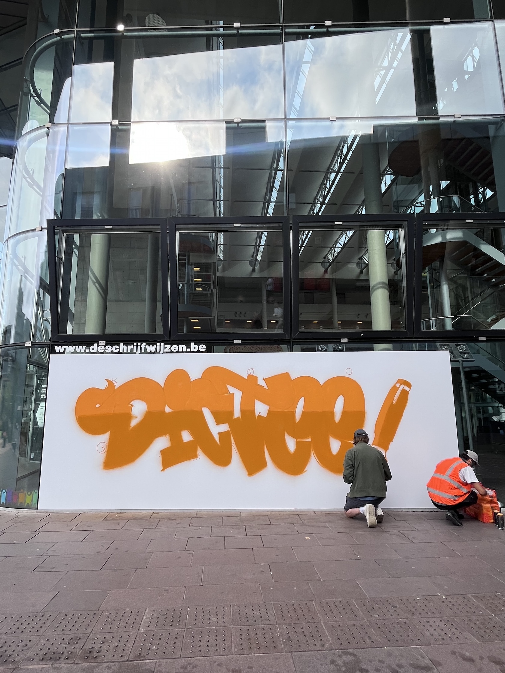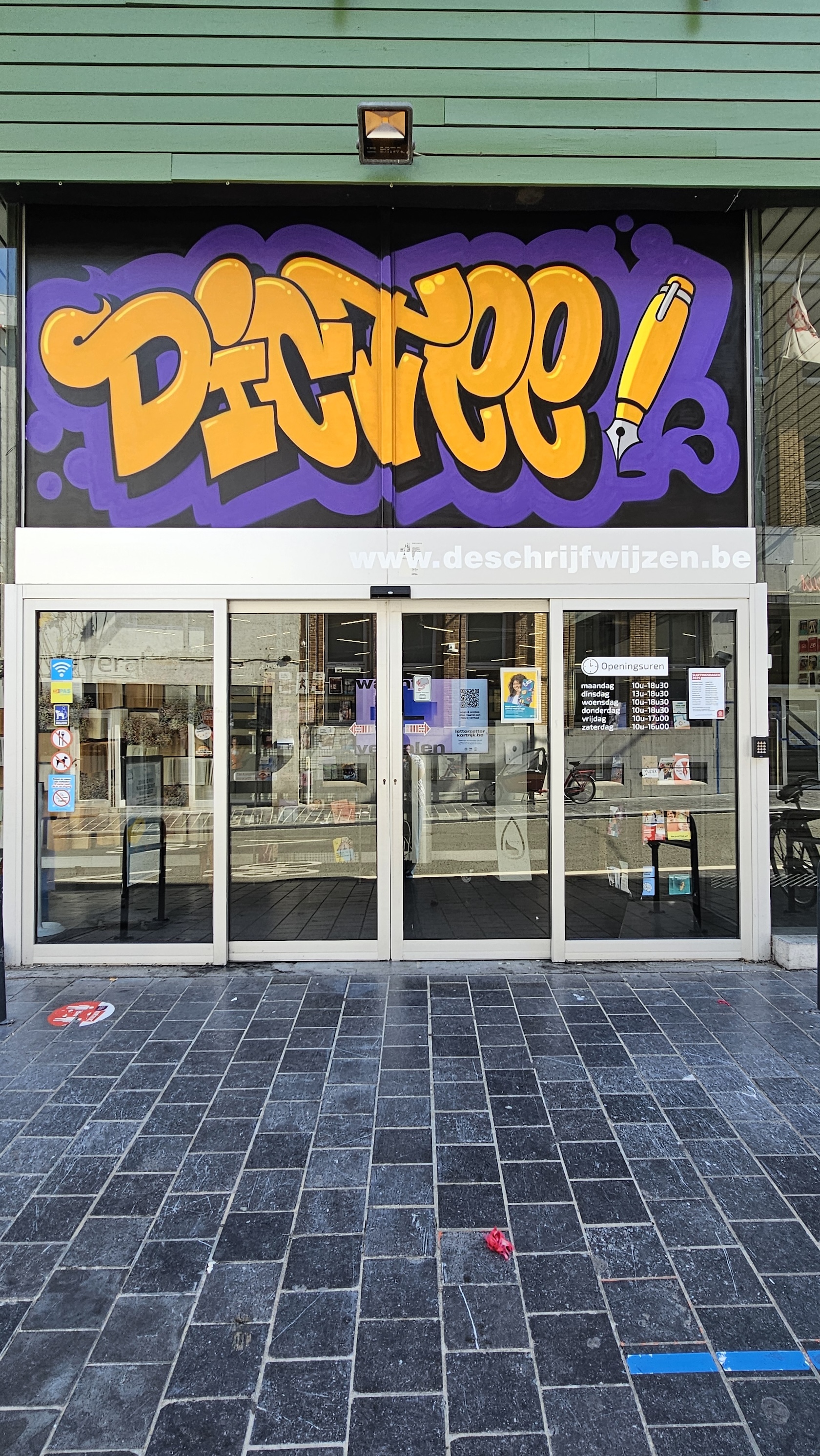 Als je vandaag naar de bibliotheek in Kortrijk of Genk gaat, zie je een metershoge graffiti van het woord DICTEE. Tot begin oktober is dat de plek voor een selfie met een taalgraffiti!